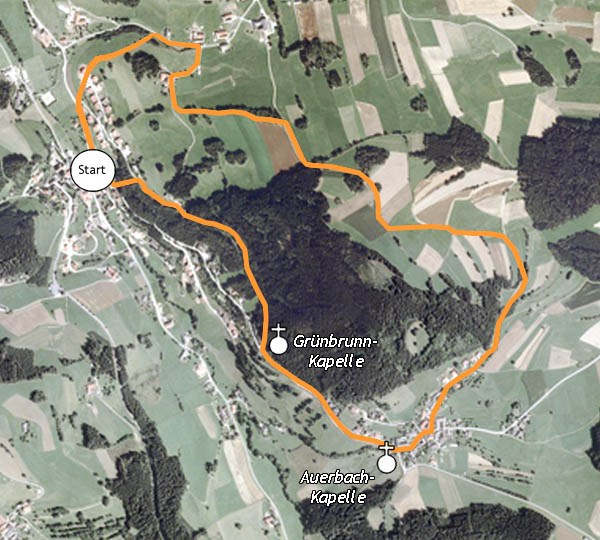 im Steinbloßstil) und Kranzlbauerhof vorbei, weiter über die „Moarschluachtn“. Schöne Aussicht nach Freistadt, St. Peter, St. Michael und Grünbach bei Freistadt. Von Auerbach über Grünbrunn, Holzwies-Binder, zurück über die Hubertuskapelle nach Hirschbach-Ort.