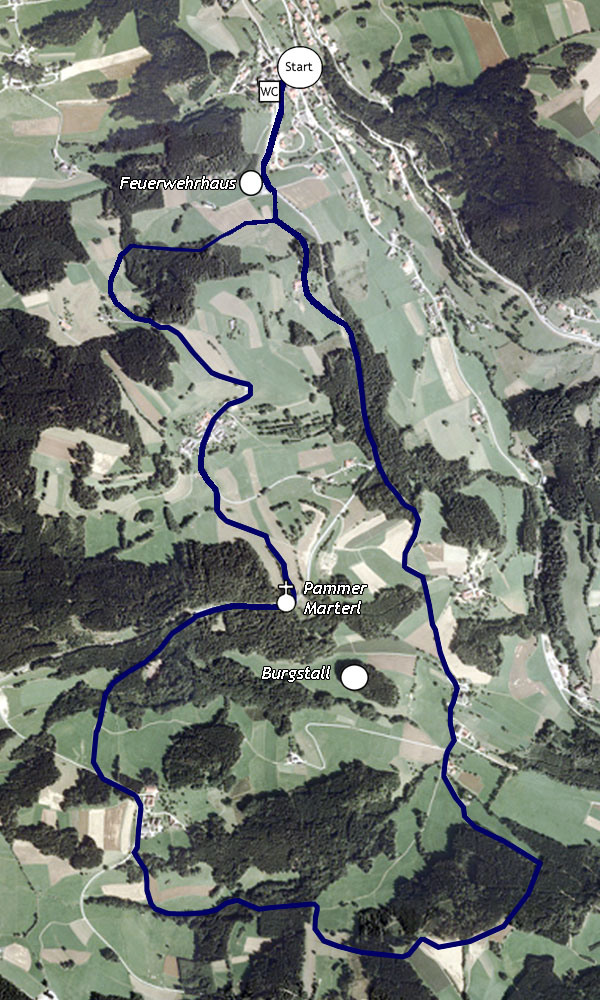 Nach dem Feuerwehrhaus - gemeinsam mit dem „Hi 8“ - rechts Richtung Hoad (ca. 800 m), jetzt nach Gossenreith. Schöne Aussicht ins östliche und nördliche Mühlviertel und ins Mostviertel Ötschergebiet. Weiter in Richtung Ottenschläger Straße. Nach dem „Pammer Marterl“ 200 m bis zur Gemeindegrenze links den alten Weg hinein nach Hofreith. Weiter über den Kerneckerberg nach Kerneck und zurück übern Stelzmüllerhof nach Hirschbach-Ort.