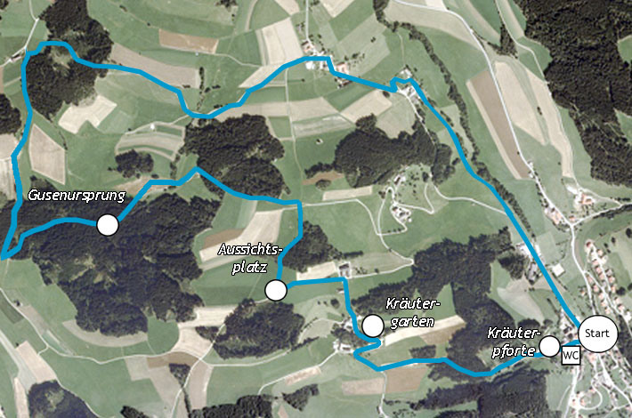 Über den Pfarrgraben nach Vorwald zum Kräutergarten/Abraham beim Grünauer links, ein Stück zusammen mit dem „Hi 7“ und dem Kräuterwanderweg bis zum „Aussichtsplatz“, dort rechts über den Mitterweg zur Hirschbacher Au und zum Gusenursprung. Hier entspringt die Kleine Gusen, die nach ca. 30 km bei Breitenbruck/Bodendorf in der Gemeinde Katsdorf in die Große Gusen mündet. Von da geht es weiter zum Keplinger in Tischberg, jetzt gleich rechts kurz auf einem Wiesenweg durch ein Wäldchen nach Oberhirschgraben. Vor dem „Koasahof“ links die Serpentine hinunter und am alten Gusenweg nach Hirschbach-Ort.