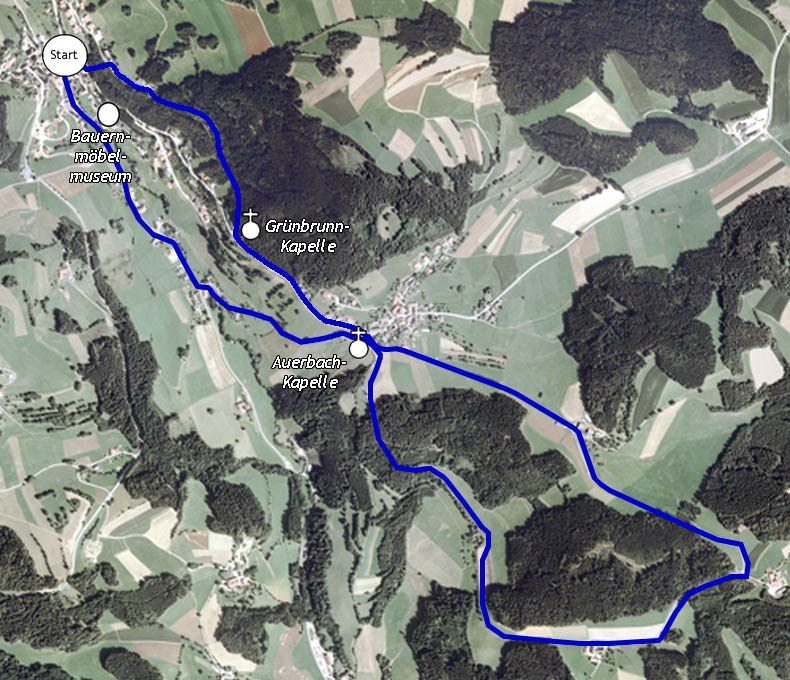 Entlang der Freistädterstraße, dann links zur Hubertuskapelle, danach zum Holzwies-Binder über Grünbrunn nach Auerbach. Danach rechts Richtung Reitersederhof. Schöne Sicht auf Hirschbach-Ort und ins östliche und nördliche Mühlviertel! Vorbei beim Maderhof, Laubershoferhof- und Hollersteinerhof wieder nach Auerbach und über den Schmiedweg in Unterhirschgraben nach Hirschbach-Ort.