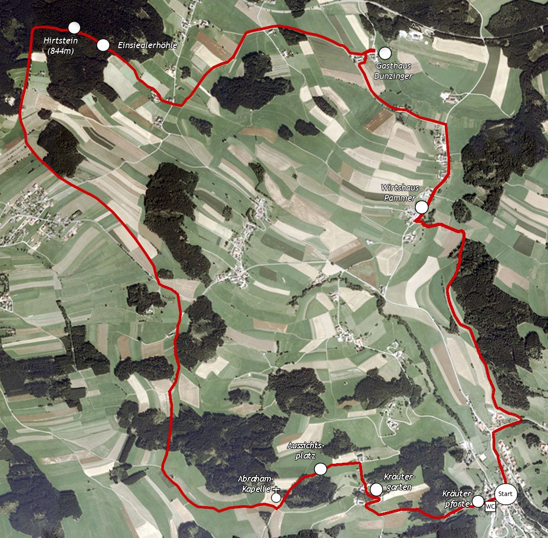 Über den Pfarrergraben, Vorwald (Kräutergarten), Abrahamkapelle und auf die Tischberger Höhe (Europäische Wasserscheide, 781 m), gleich wie der Kräuterwanderweg. Weiter zur Kalvarienbergkirche (Blick nach Schenkenfelden) und zum Hirtstein (844m), 2. höchster Punkt in der Gemeinde Hirschbach. Bei der „EINSIEDLERHÖHLE“ am Thierberg vorbei, weiter zur Kräutertrocknungshalle der Familie Bergsmann, Kräuterbauer in Oberdorf, danach parallel mit dem Bergkräuterwanderweg und der Kalvarienberg-Runde. Ein Abstecher zur Kräuterei der Bergkräutergenossenschaft mit Direktverkauf (Geöffnet: Mo.-Fr. von 8-12 und 13-17 Uhr) in Thierberg 1, an der B 38, lohnt sich! Dann weiter zum Kräuterwirt Dunzinger (Ausblick auf den Flugplatz) rechts nach Guttenbrunn, beim Wirtshaus Pammer links, wie „Hi 3“, und nach ca. 300 m rechts zurück Hirschbach-Ort.
